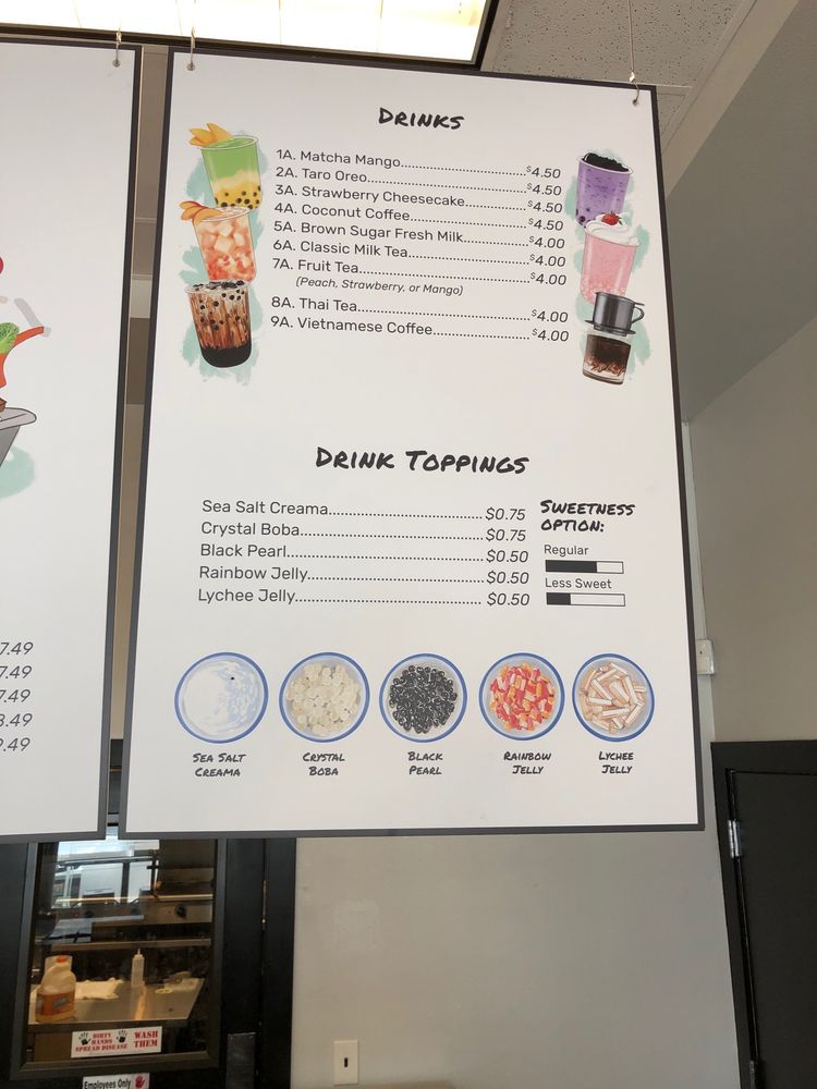Toppings are extra. Regular or less sweet. Add toppings for an additional charge. Different milk for an additional charge.